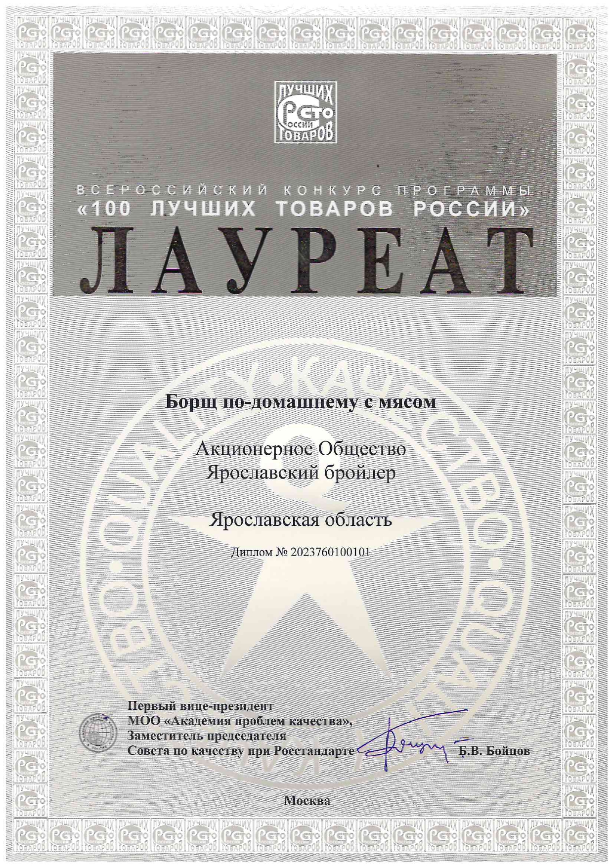 Самое главное награждение — диплом, полученный компанией «Ярославский Бройлер» за «Лучшую работу в области обеспечения качества». Заслуженная награда является гарантом пищевой безопасности всей продукции, производимой предприятием.
