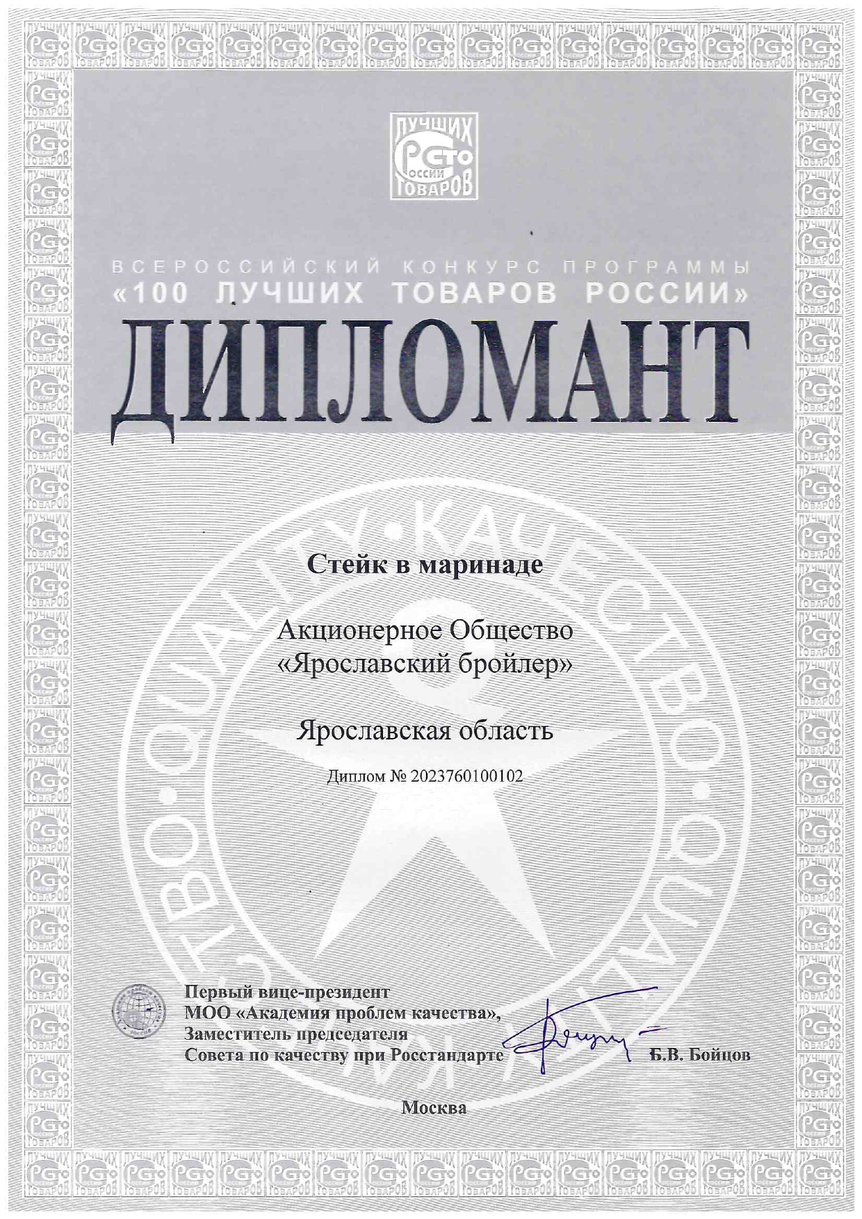 Российский знак качества является уникальным торговым преимуществом. Отметка качества работы предприятия государством — это очень важная награда. Это Российское признание и выход на уровень элитных и качественных товаров для потребителей российского рынка. «Поздравляю коллектив предприятия «Ярославский бройлер» с получением высокой награды — государственного Знака качества. Это предприятие давно заслуживает самых высоких наград. Руководство и коллектив «Ярославского бройлера» ставит перед собой амбициозные задачи, с успехом решают их и работают на перспективу.