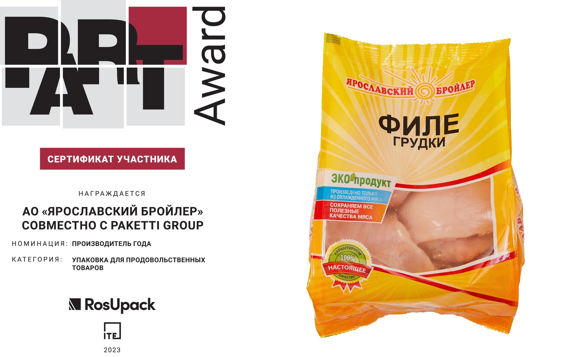 Наш пакет флоу-пак стал номинантом ежегодной международной Премии PART Award в области производства и дизайна упаковки. Пакет флоу-пак для упаковки мяса птицы мы внедрили первыми в отрасли в сентябре 2022 года.