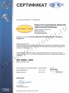 Система менеджмента безопасности пищевой продукции ОАО «Ярославский бройлер» подтверждена сертификатом соответствия ИСО 22000:2005