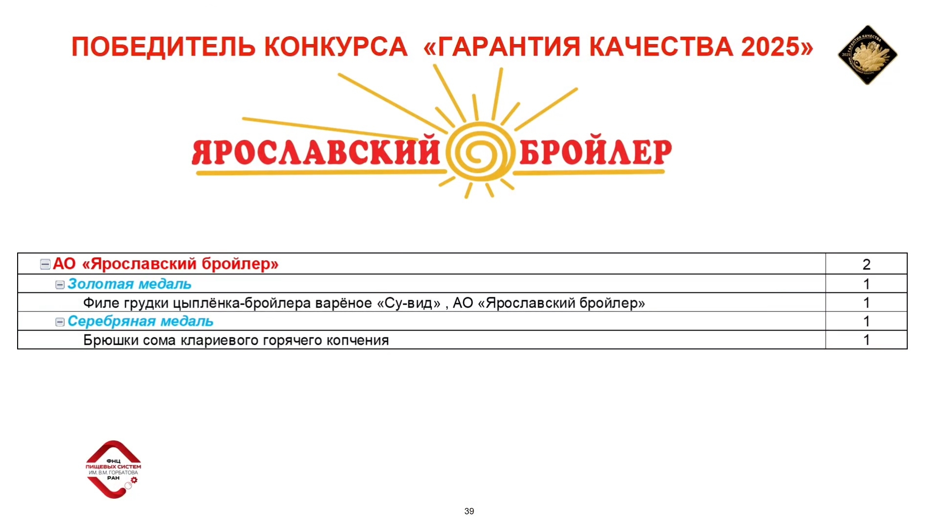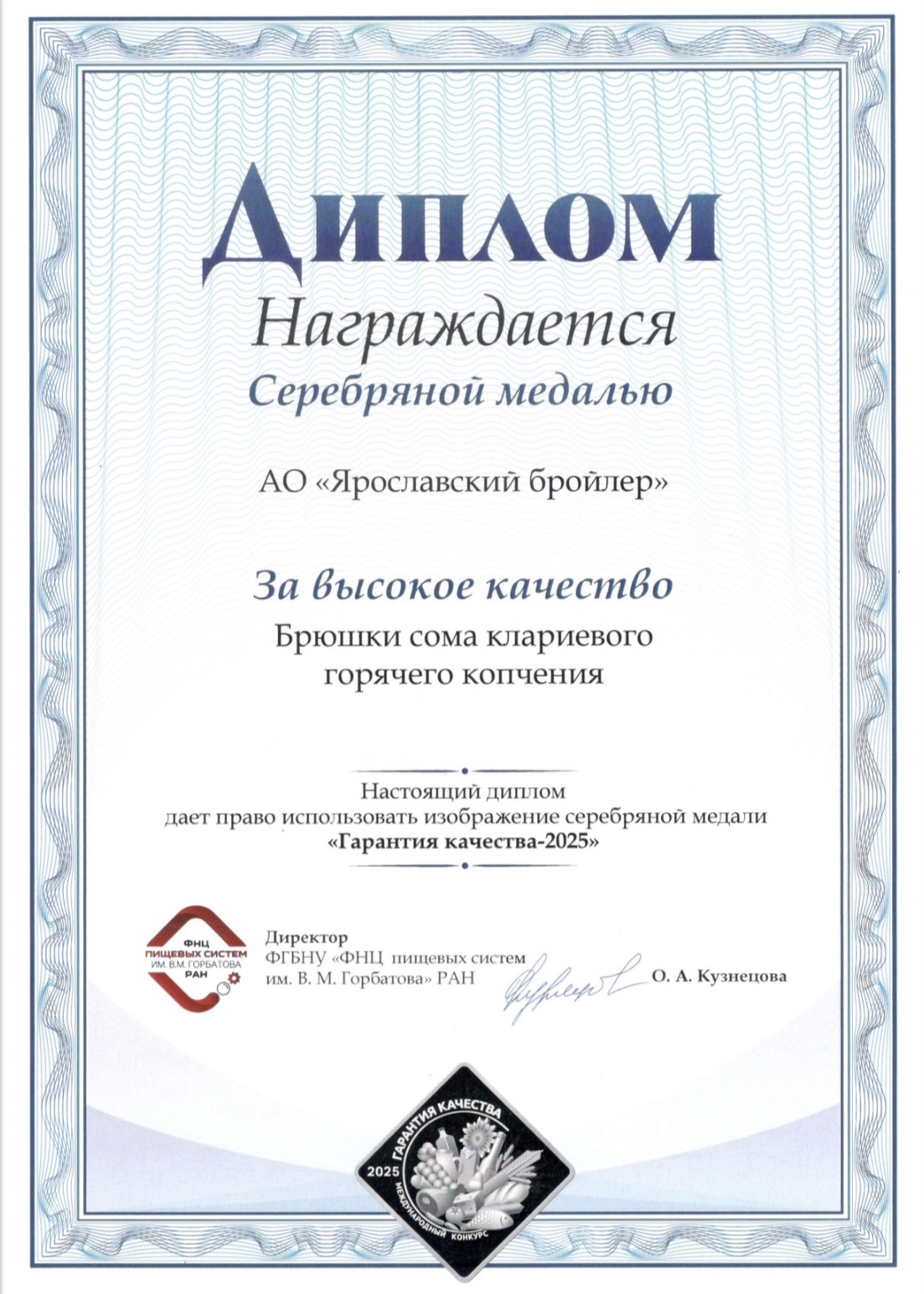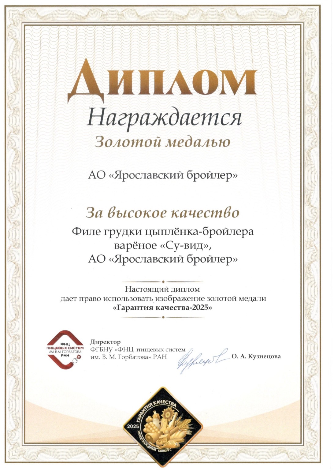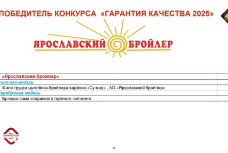 Продукция компании «Ярославский бройлер» стала лауреатом Международного конкурса качества пищевой продукции «ГАРАНТИЯ КАЧЕСТВА-2025»!