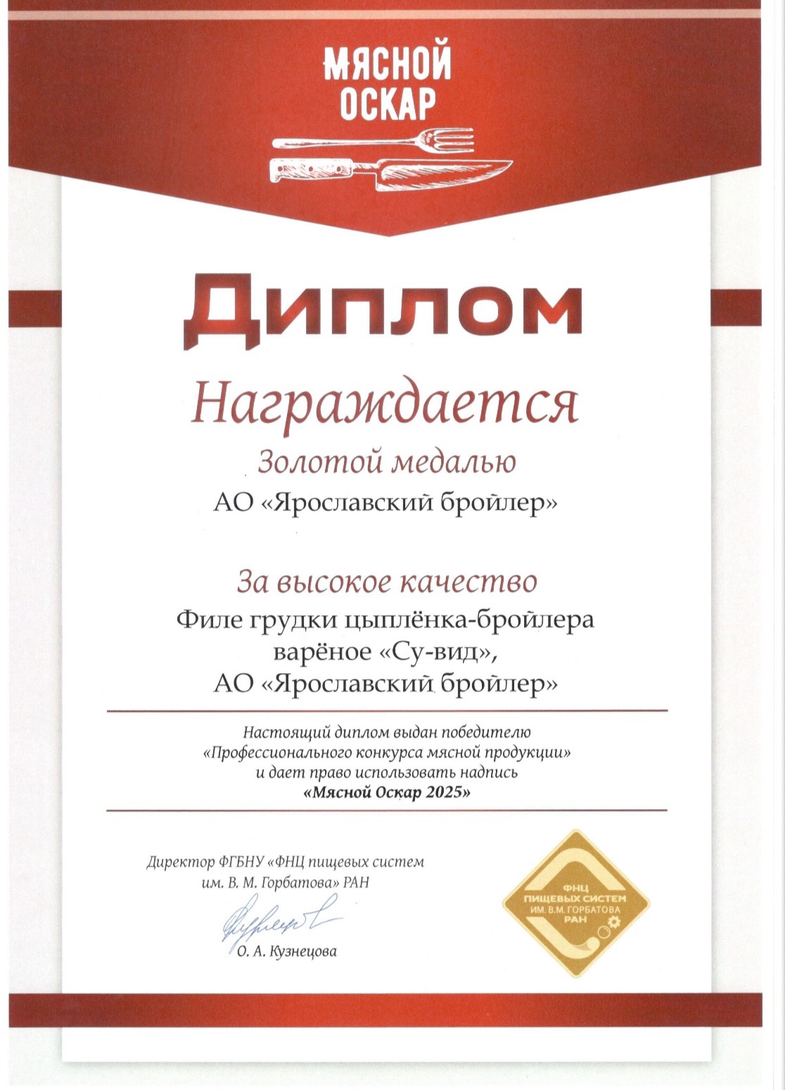 Кроме того, филе грудки «Су-вид» удостоено золотой награды «Мясной Оскар»!